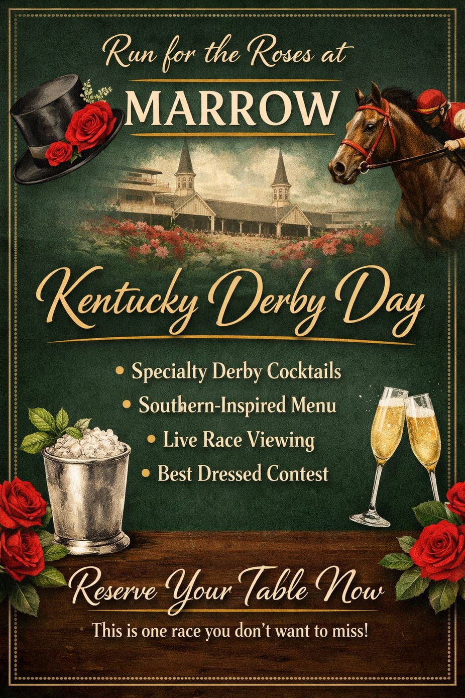 g Hats. Strong Bourbon. Fast Horses. Grab your crew, throw on your best Derby fit, and get ready for: 🥃 Mint Juleps flowing 🍗 Southern-inspired features 🎉 High-energy atmosphere